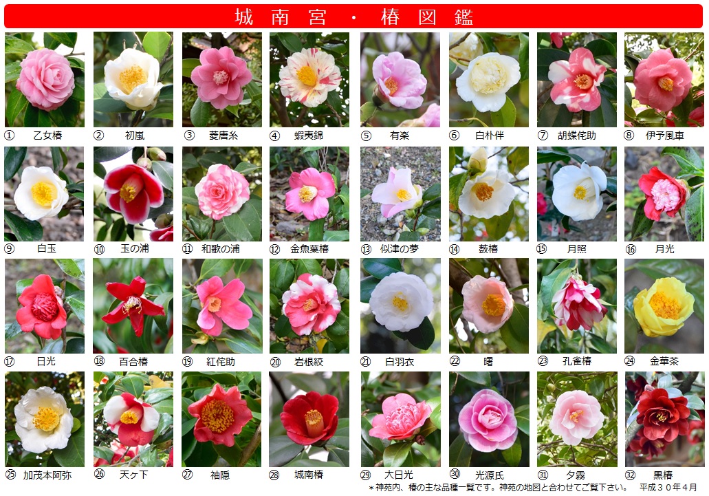 1~32は、上段で紹介している「城南宮 椿図鑑」内の椿の場所を示しています。