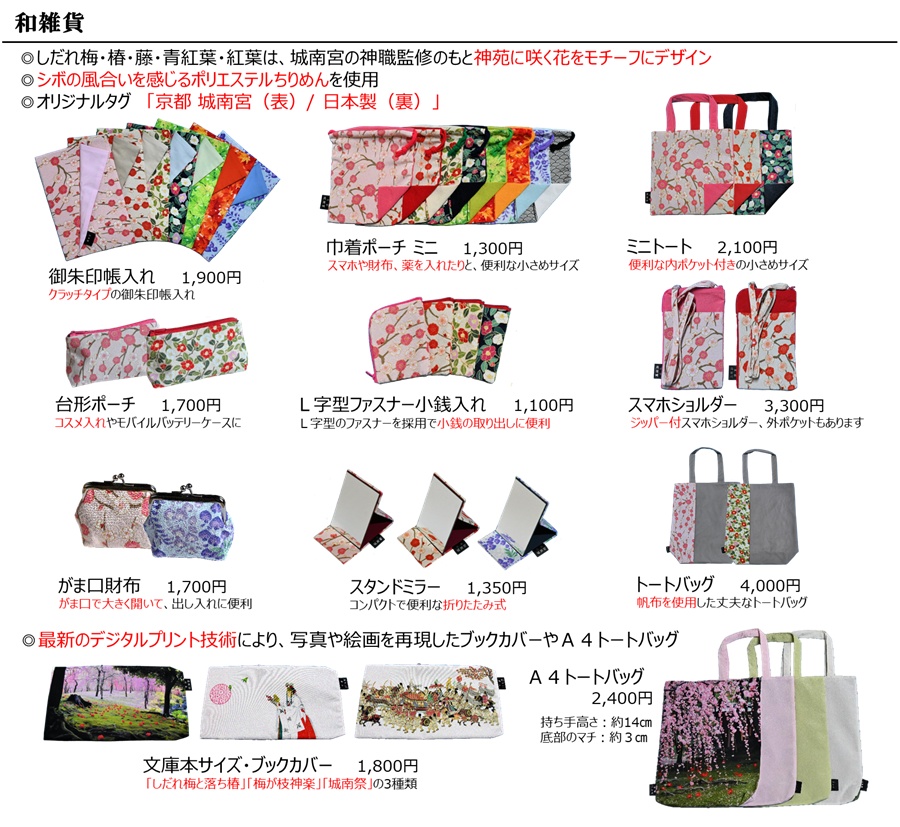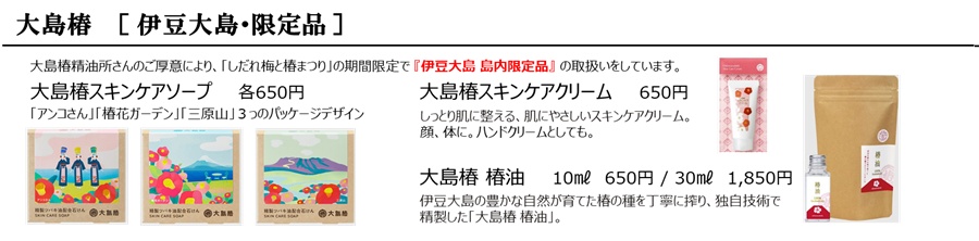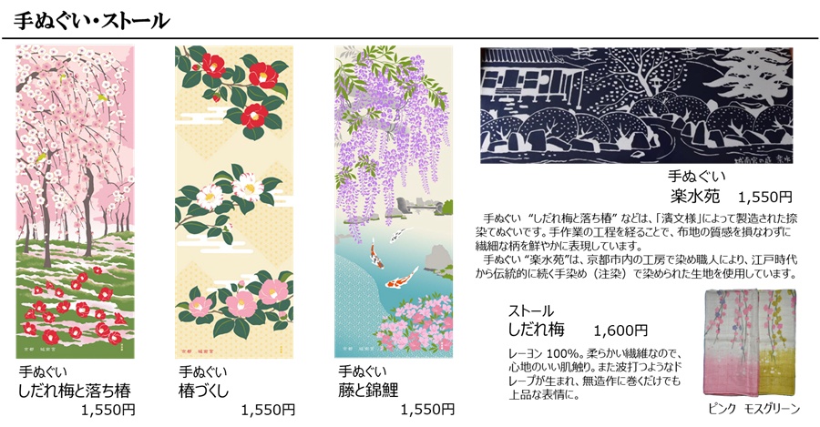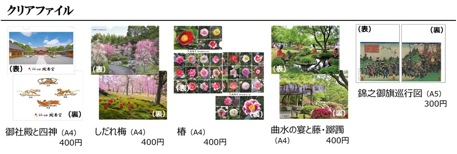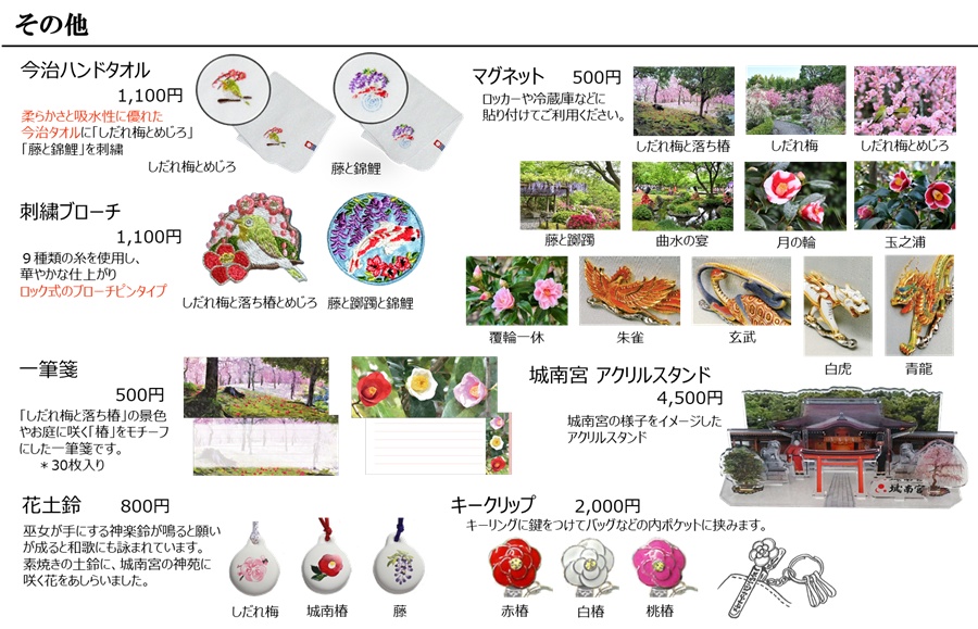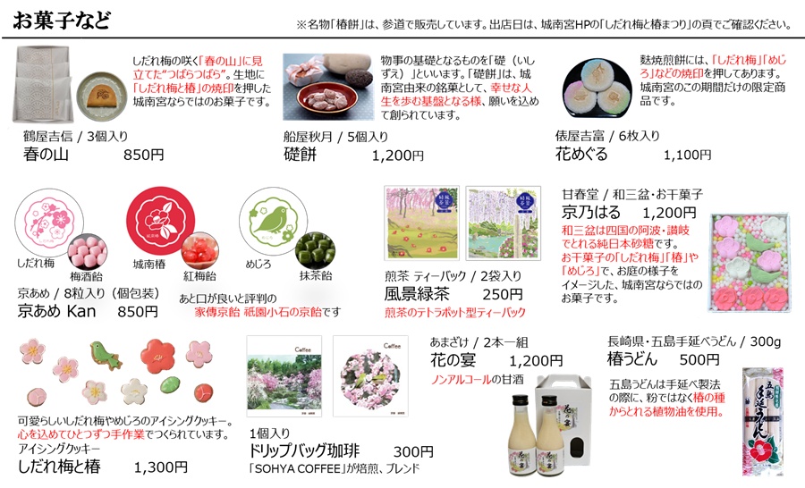 神苑に咲く花をモチーフにしたオリジナルの参拝記念品をはじめ、「しだれ梅」や「椿」 にこだわった商品を普段より品揃えも多くしてお待ちしていますので、是非お立ち寄りください。とりわけ「しだれ梅」をモチーフにしたグッズは、世の中にほとんど見られず、離宮茶屋が創出したここだけにしかない一品です。