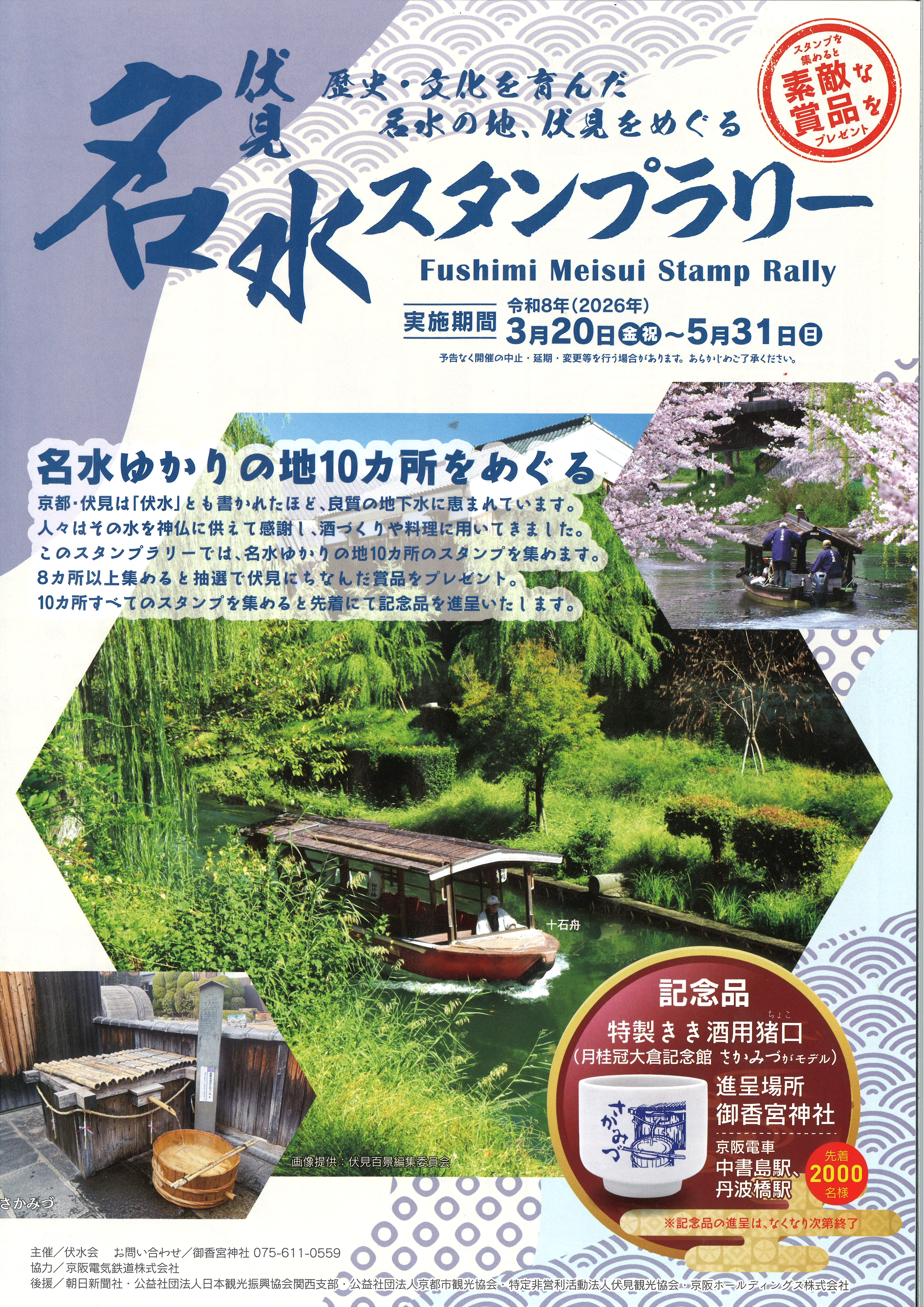 - 伏見の名水10カ所を巡るスタンプラリーです。5カ所以上のスタンプを集めて応募すると、抽選で伏見にちなんだ賞品をプレゼント。全てのスタンプを集めると、先着2,000名に「特製きき酒用猪口」が進呈されます。賞品の応募方法など、スタンプラリーの詳細は、京阪電車各駅などで配布のスタンプ用紙をご覧ください。