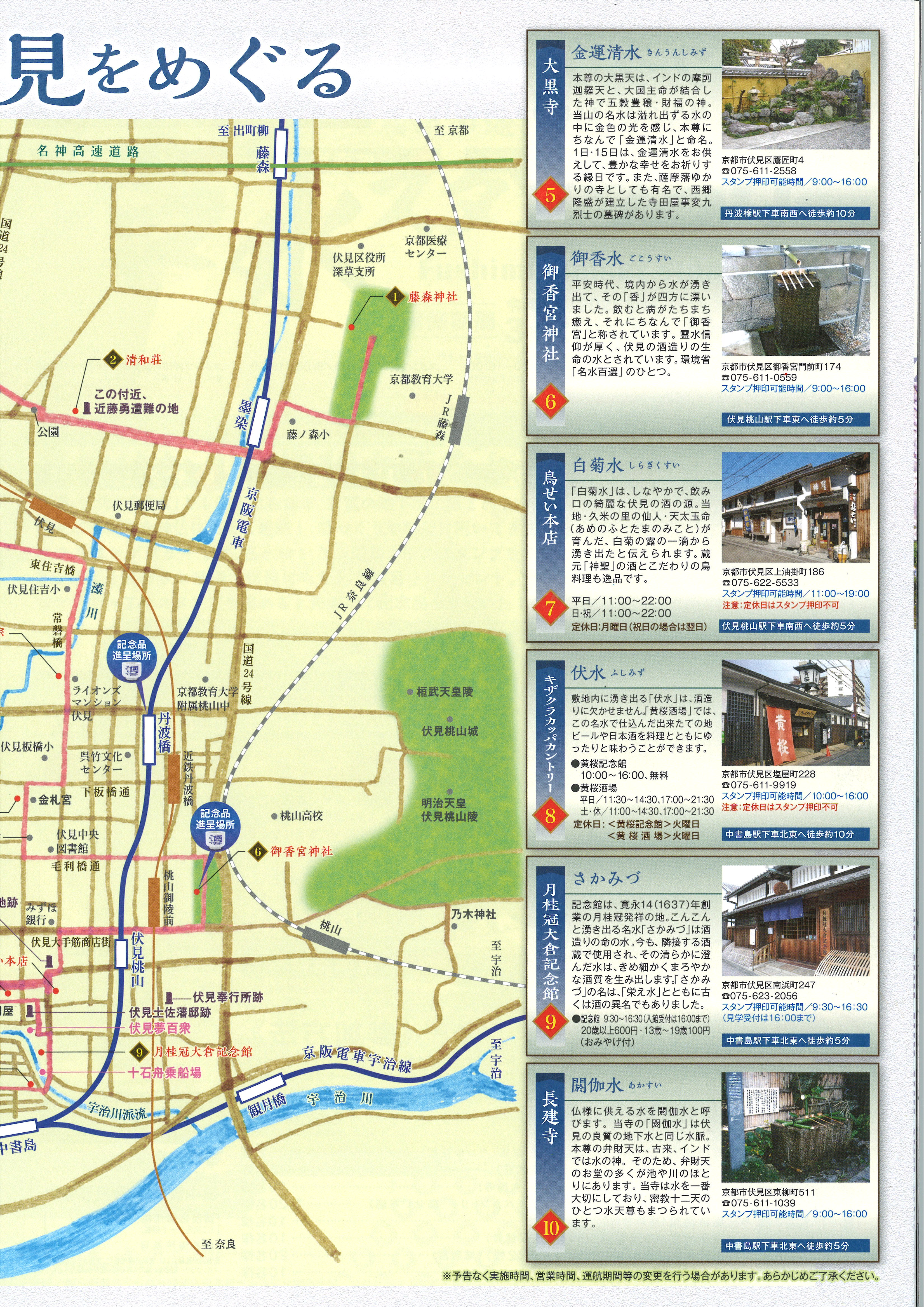 藤森神社 / 清和荘 / 城南宮 / キンシ正宗 /大黒寺 / 御香宮神社 / 鳥せい本店 / キザクラカッパカントリー / 月桂冠大倉記念館 /長建寺