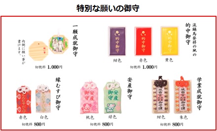 御札や御守は願い事に応じて様々な種類があります。初詣の際に、家族の名前を順番におっしゃいながら、通園安全・学業成就・交通安全と、一人一人の御守を受けられる方が多くいらっしゃいます。このように、御守は、常に神様に守られ、励ましていただいているという証です。携帯電話に付けたり、財布やカバンに入れて身近に持ち、あるいは、会社や自宅の机に置いて大切にしてください。