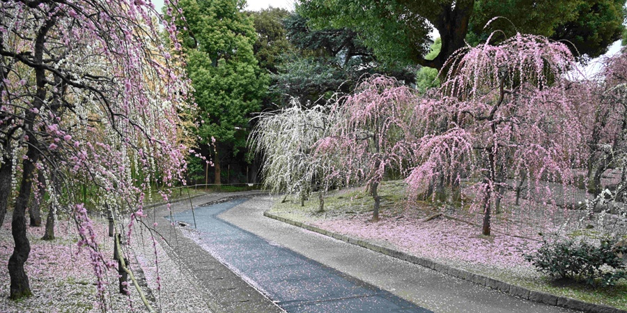 しだれ梅は、昨日の雨の影響で散り始め、花びらの絨毯がよりキレイに見られるようになっています。