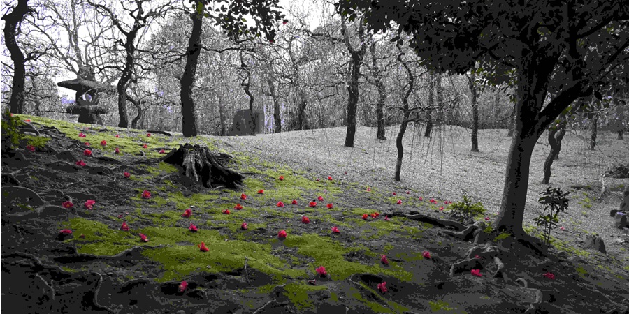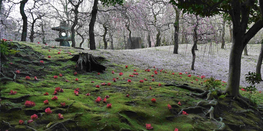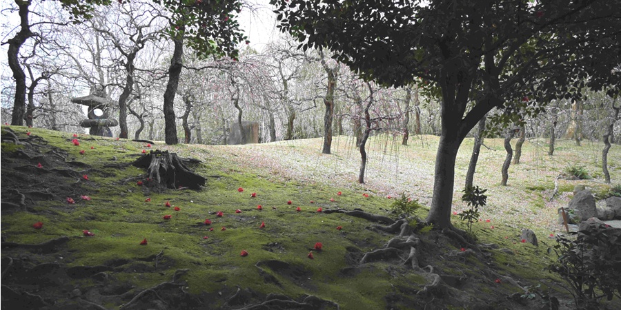 しだれ梅は、ずいぶん散っていますが、落ち椿の景色はお楽しみ頂けます。