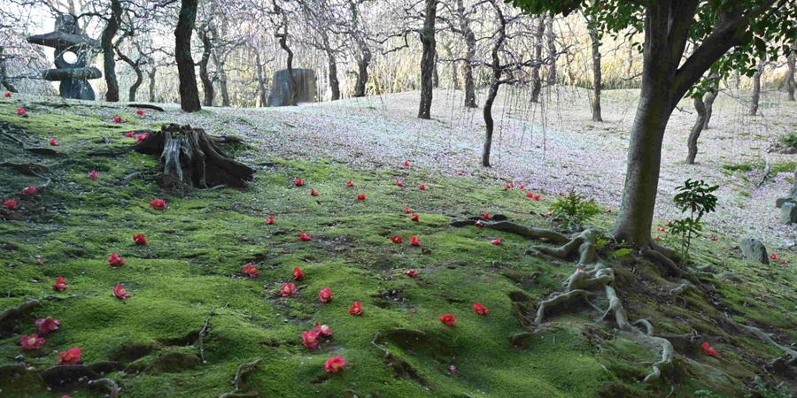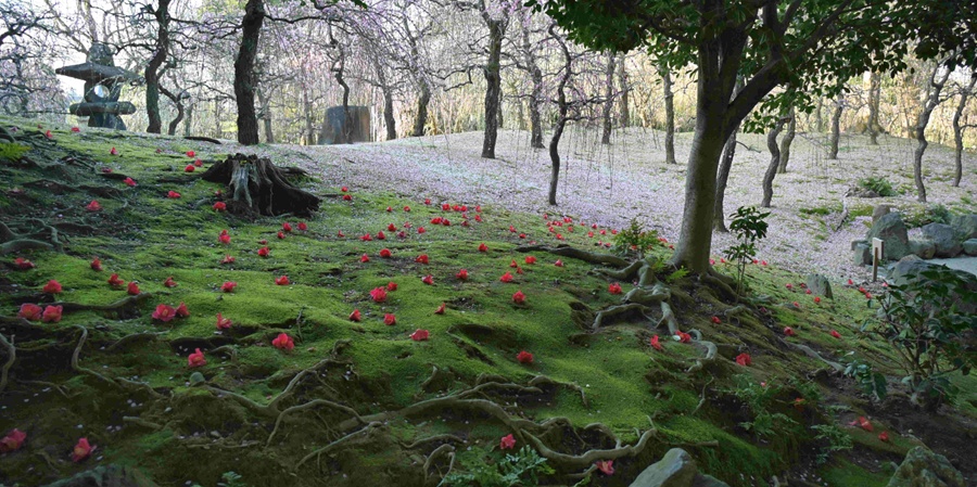 しだれ梅は、ずいぶん散っていますが、落ち椿の景色は引き続きお楽しみ頂けます。